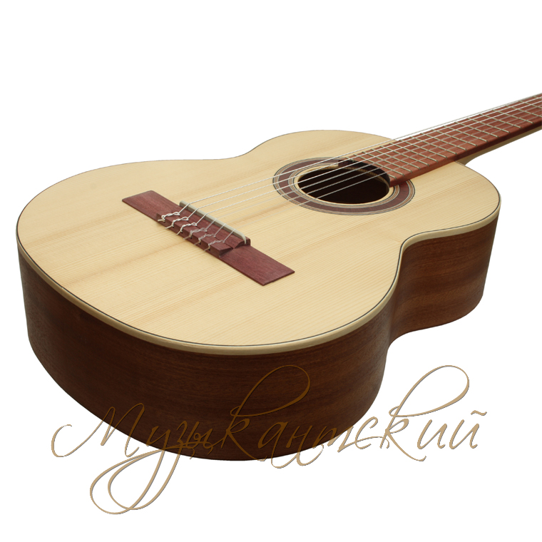 Гитара размера 3/4 которая подойдет для возраста 10-15 лет. Но также этот размер гитары подходит и для взрослого человека невысокого роста. Верхняя дека выполнеа из массива ели, обечайка и нижняя дека из сапеле, мензура 580мм.